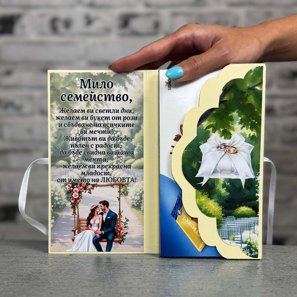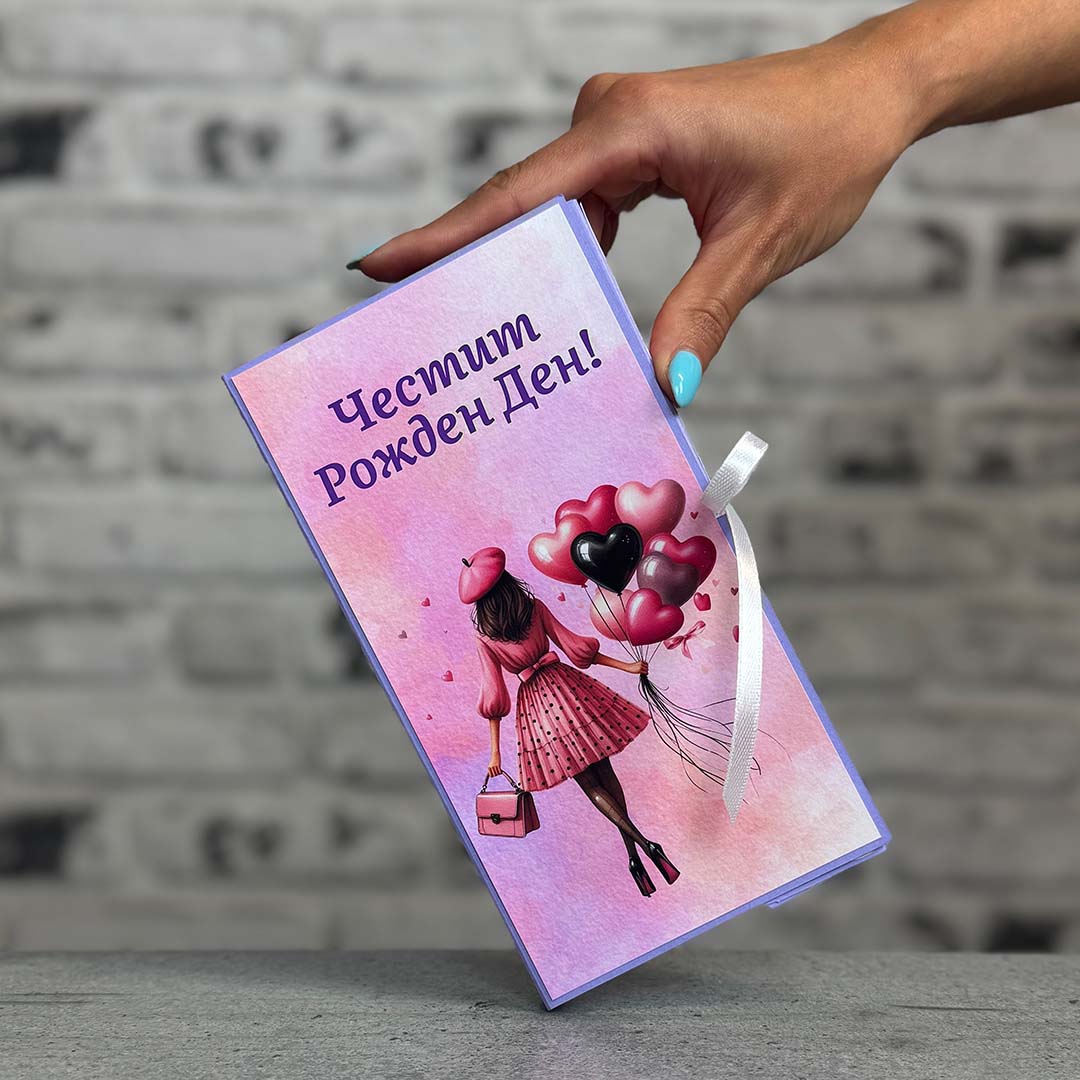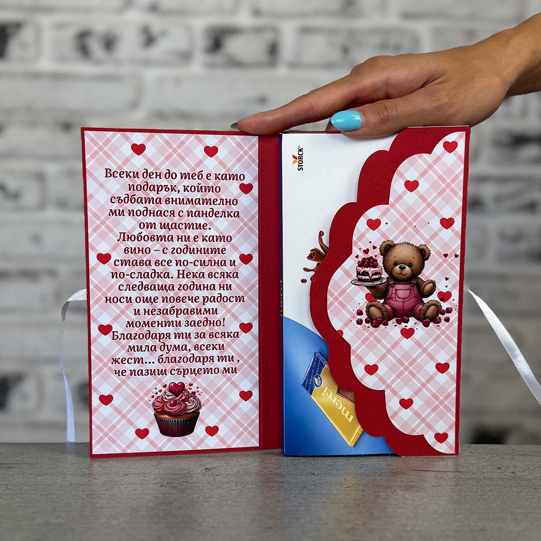 Картичката е изработена от 220gsm картон и висококачествена матова хартия. Има опция за разпечатване на Ваш текст/пожелание и специален джоб ,в който е поставен шоколад , като може да се добави и паричен подарък.