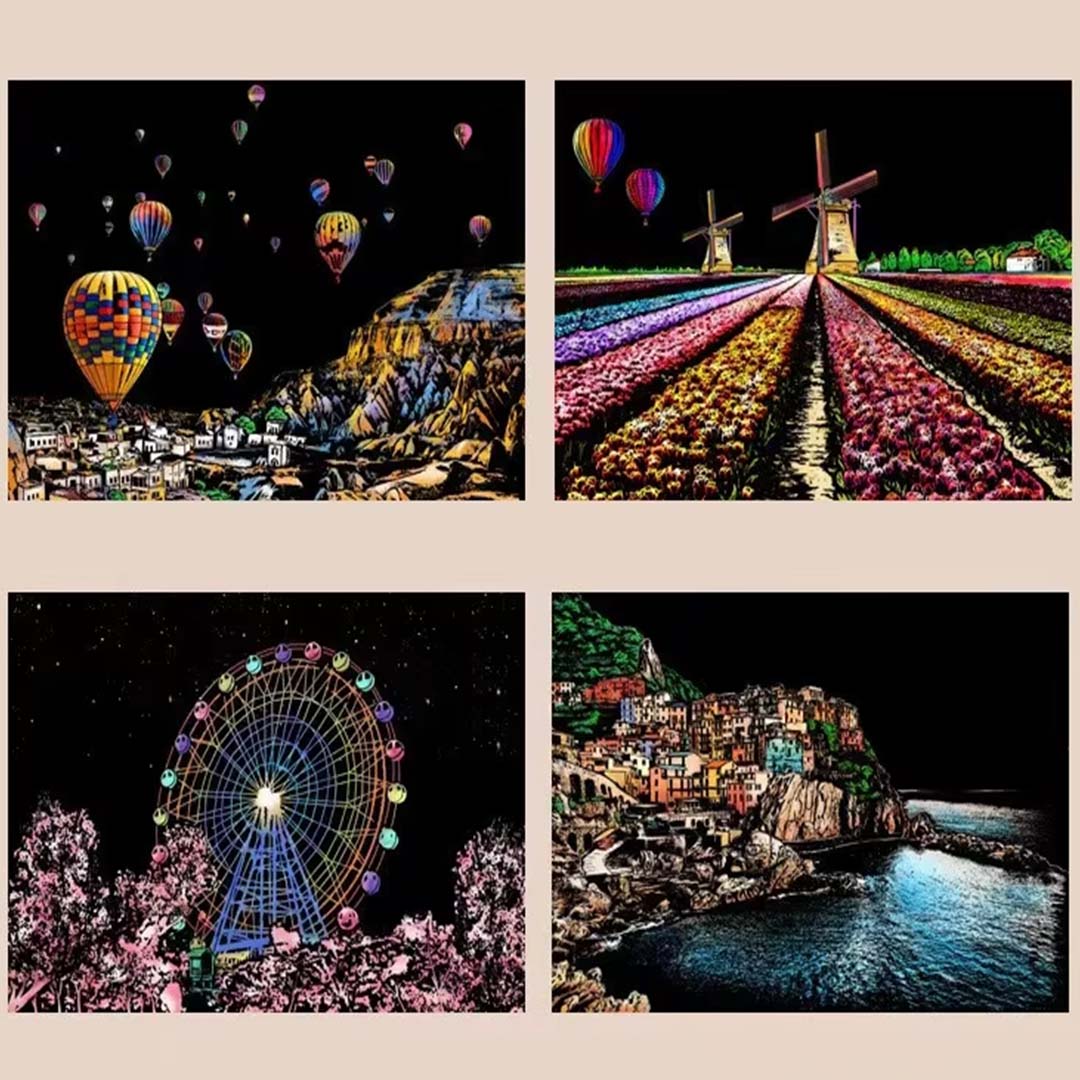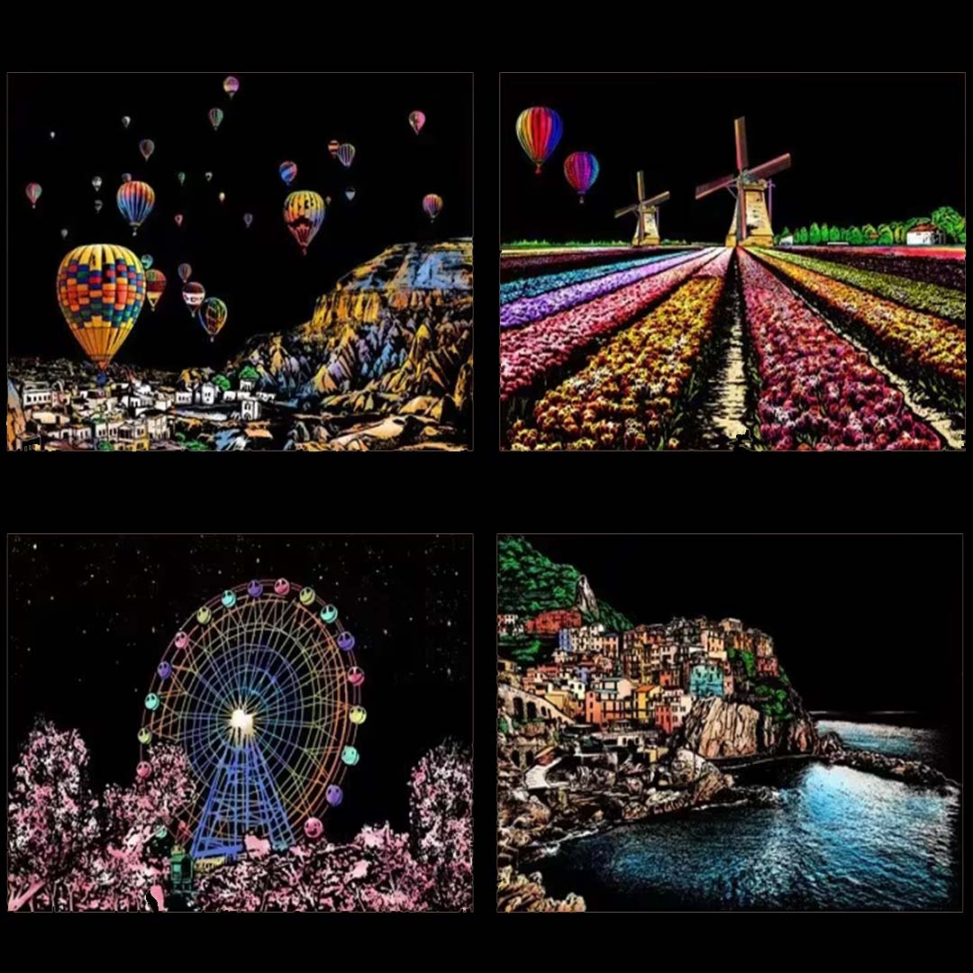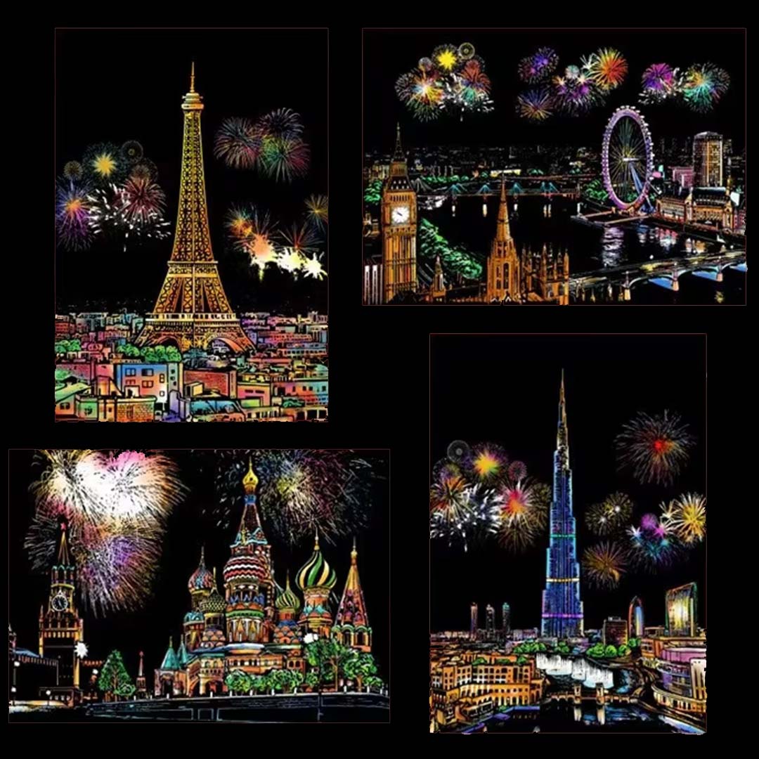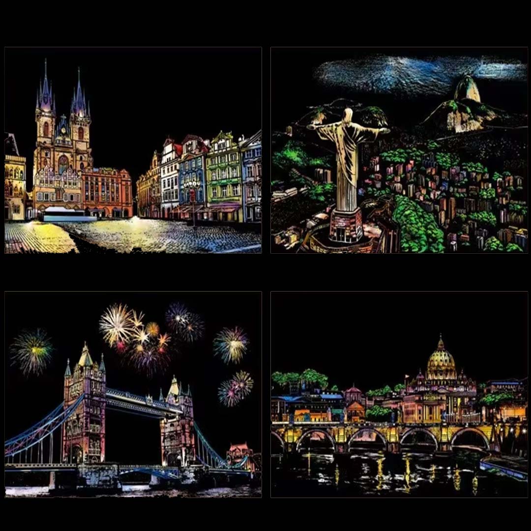 Scratch Art Cityscape е модерно творческо хоби и начин да се потопите в свят на релаксация, цвят и вдъхновение. То съчетава удоволствието от рисуването с елемента на изненада – всяко остъргване разкрива скрит под сивотата град, озарен от ярки цветове.